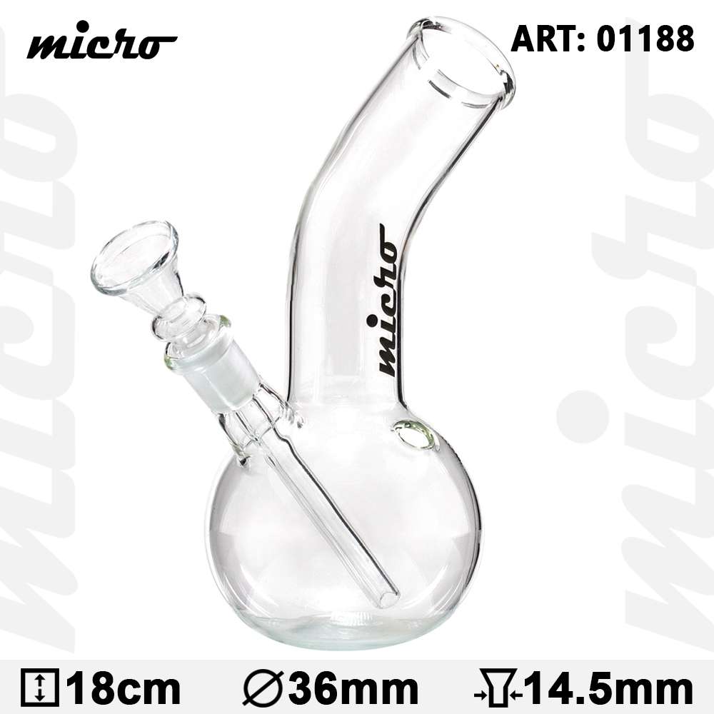 This is a fantastic small Glass bong made by MICRO. It is 16cm in height and has a glass downstem with attached conepiece. It has a rush hole on the side for that nice toke angle.